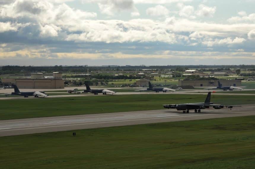 Such exercises are regularly scheduled to check the B-52 Stratofortresses’ ability to respond to threats at a moment’s notice. During this training events, aircraft are launched by a method known “cart-starts” from cartridge starts: a small-controlled explosive is inserted into two of the eight engines of the heavy bomber. The charges jumpstart the engines (the remaining engines are started while the aircraft taxies to the runway) removing the need to use ground equipment normally used for aircraft’s startup.