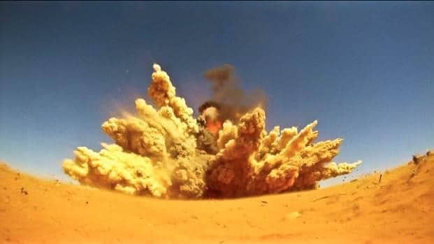 An unexploded “Hakim” is blown up by MAG (Mines Advisory Group) at Zintan airfield during a demo last week.