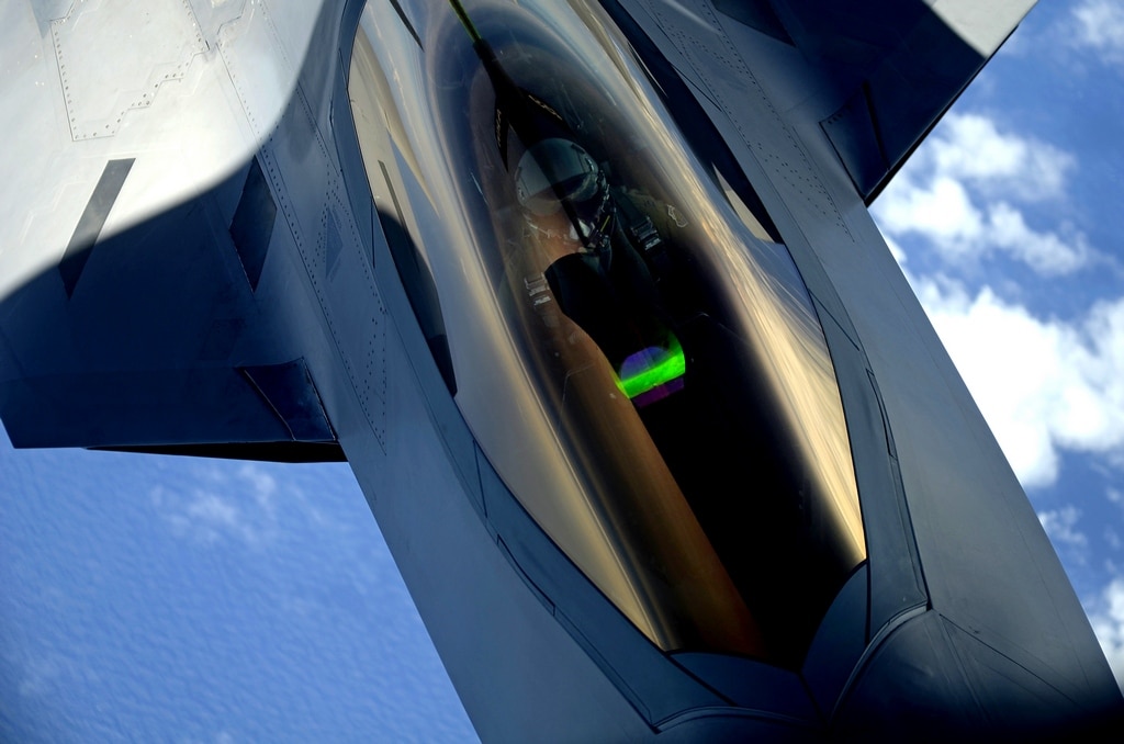 This cool close up picture shows how an F-22 Raptor appears from the boom operator’s windown on a KC-135 Stratotanker of the 756th Air Refueling Squadron, Joint Base Andrews Naval Air Facility, Maryland.