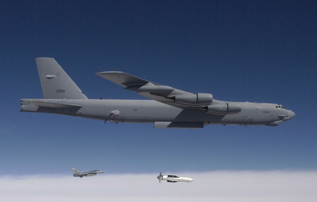 A B-52 releases a test version of the Massive Ordnance Penetrator (MOP) during a test of the weapon over White Sands Missile Range, N.M. in 2009 (DoD Image)