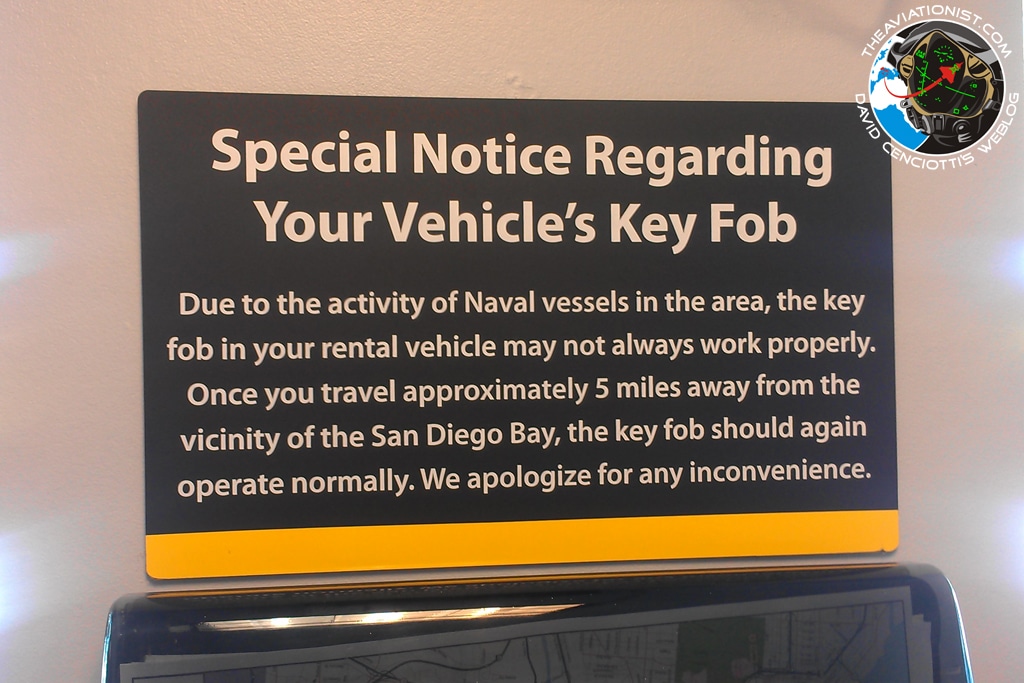 Taken at the Hertz Rental counter at San Diego International Airport, the below photograph shows a sign used to warn people of the possible interferences to vehicles key fobsย caused by naval vessels activity in the Bay area.