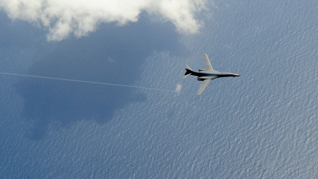 It shows a B-1B as it crosses the Atlantic Ocean on its way to Dyess Air Force Base, Texas. The aircraft (#85-0064) had taken off from RAF Mildenhall as “Rama 81 Heavy” along with Quid 63, an accompanying tanker of the local-based 100th Air Refueling Wing.