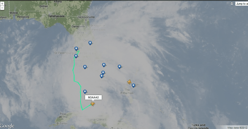 Currently flying north of Cuba (around the Bahamas) are NOAA 42 (Lockheed WP-3D Orion) and NOAA 49 (Gulfstream G-IV), both from MacDill Air Force Base, Tampa, coordinated by National Hurricane Center in Miami, Fla.