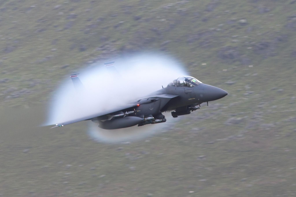 Taken on Aug. 22 by Rob Birmingham, the following image shows a U.S. F-15E belonging from RAF Lakenheath as it generates a condensation cloud during a low level sortie in the famous Mach Loop.