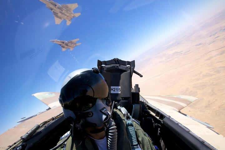The picture show an F-15I’s WSO (Weapon System Officer) as his plane breaks from a formation (whose remaining two elements are visible above the aircraft in foreground).