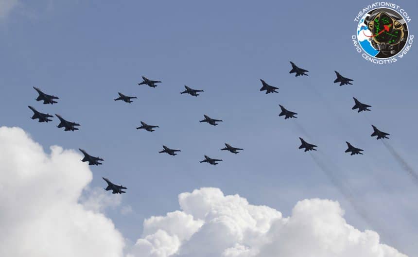 Even if some heavy formations of Tu-95 and Tu-160 strategic bombers took part to the airshow held at Zhukovsky, Moscow, on Aug. 11 and 12, to celebrate in spectacular style the 100th anniversary of the Russian Air Force, one of the highlights of the event was the flypast of 21 aircraft, consisting of 5 Su-27s, 8 MiG-29s and 8 Su-25s.