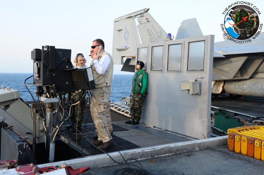Under LSOs’ disposal is a specially-provided radio-equipped emplacement fitted out with light controls, control workstation, Integrated Launch and Recovery Television Surveillance System (ILARTS) -that is a sort of camera aligned with the deck which catches and tapes any approaching plane and has eventually replaced the outdated Pilot Landing Aid Television (“PLAT”, on all carrier’s closed-circuit televisions)- and the Head Up Dislpay, which supplies the aircraft and vertical speed as well as the wind direction and intensity. Paddles job has very little to do with technology though and it mostly calls for a well-trained eye for the concise guidelines pilots are provided with over the radio are based almost only upon visual perceptions of the pilots who watch the in-coming traffic from the LSOs platform and suggest the various corrections according to aircraftโs landing and nav lights.