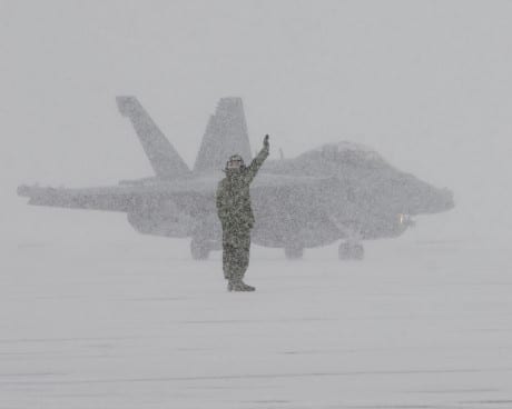 I wonder which were the weather conditions (and, in particular, the visibility) when the EA-18G depicted in the following image landed from a flight during massive snow storm at Naval Air Facility Misawa, Japan.