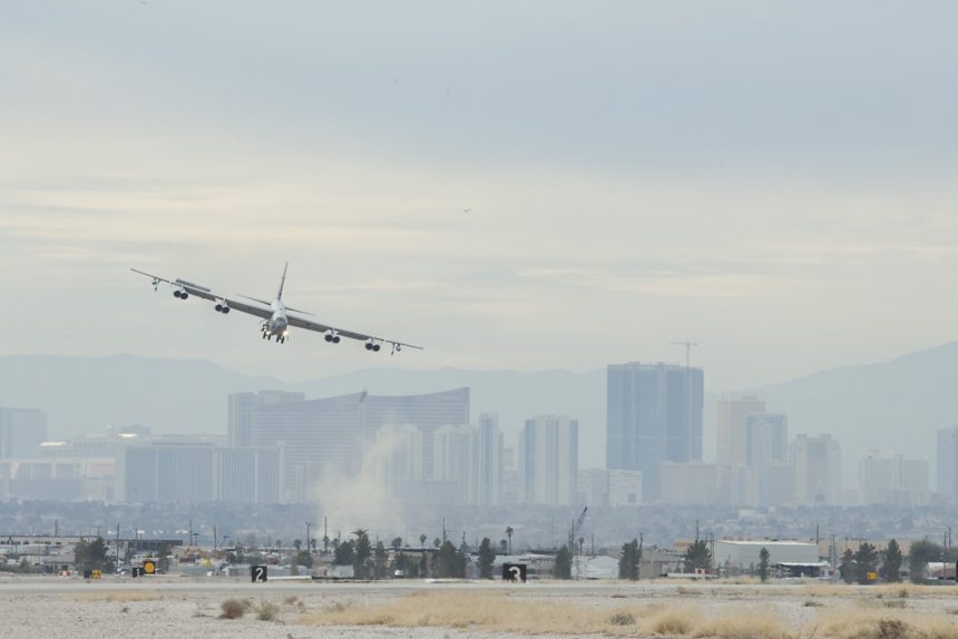 Taken on Jan. 24, during Red Flag 13-2 currently underway, the following cool image shows a B-52 Stratofortress from Barksdale Air Force Base, La., banking on approach to Nellis Air Force Base with Las Vegas clearly visible in the background.