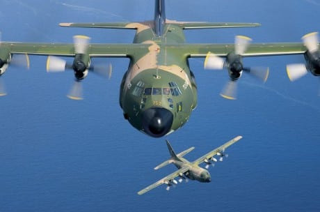 The following image shows a C-130 belonging to the 356 MTM (Tactical Transport Squadron) of the Hellenic Air Force flying with another plane of the same type, wearing the typical camouflaged color scheme still used by many Greek planes.