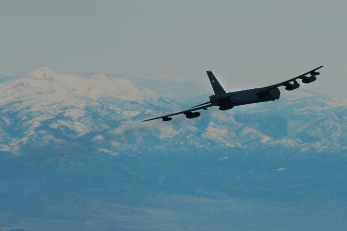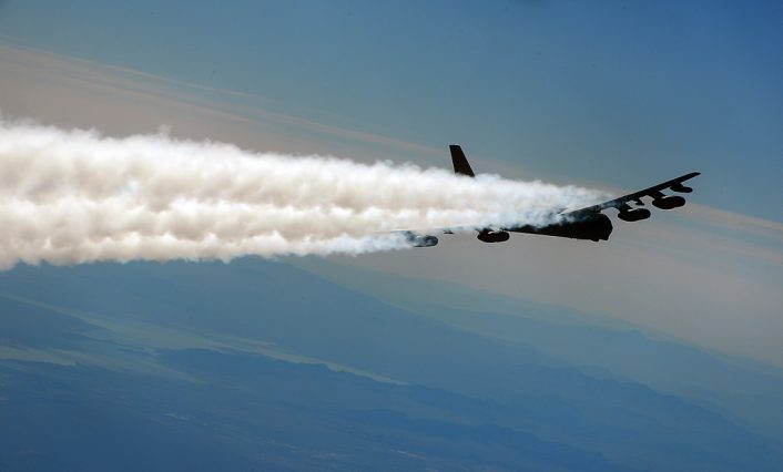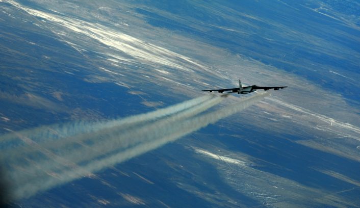 The B-52 has eight turbojet engines, each capable of producing 17,000 pounds of thrust, with a top speed of 650 miles per hour. They leave long white contrails over Nevada during the training mission.