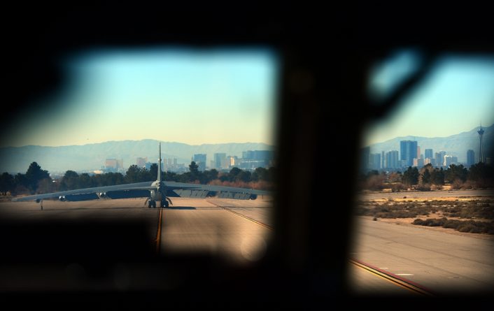 They show a B-52H Stratofortress assigned to the 20th Bomb Squadron, from Barksdale Air Force Base, Louisiana, flying a Red Flag sortie from the famous airport located northeast of Sin City.