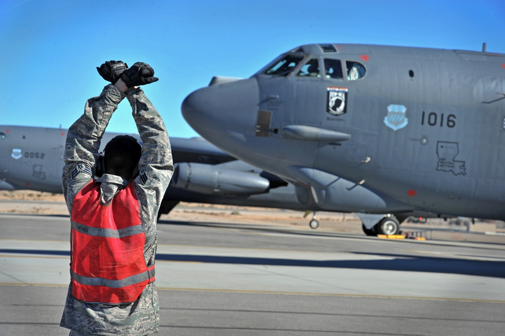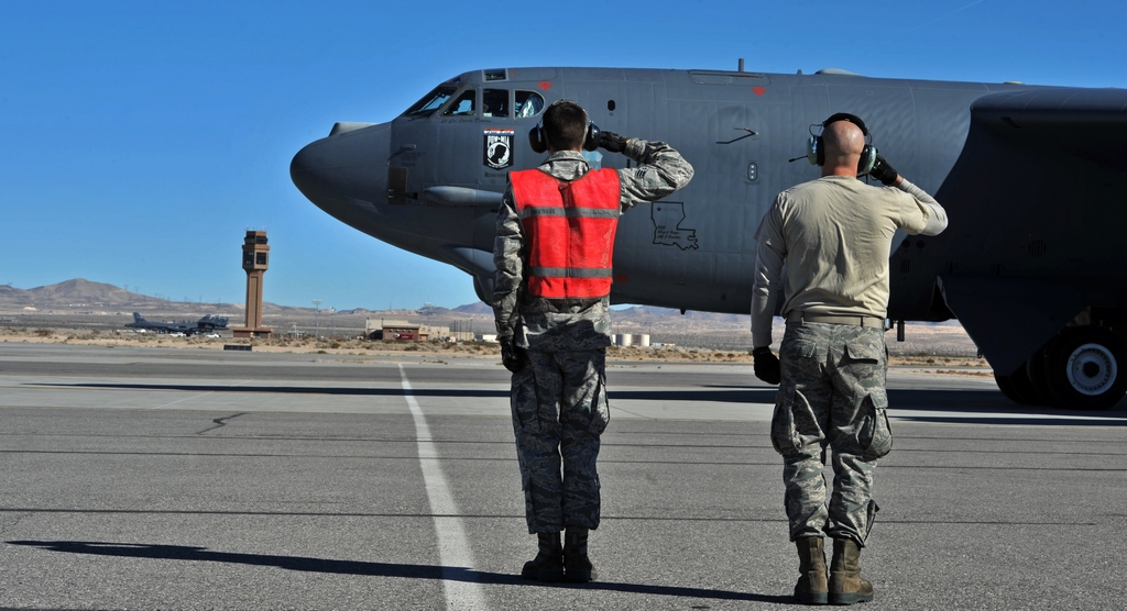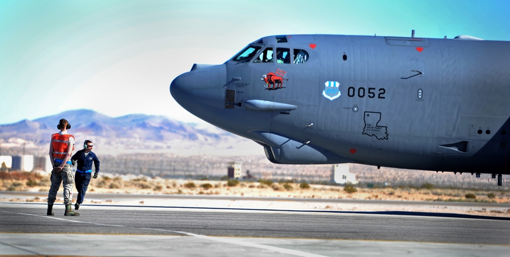 They show a B-52H Stratofortress assigned to the 20th Bomb Squadron, from Barksdale Air Force Base, Louisiana, flying a Red Flag sortie from the famous airport located northeast of Sin City.