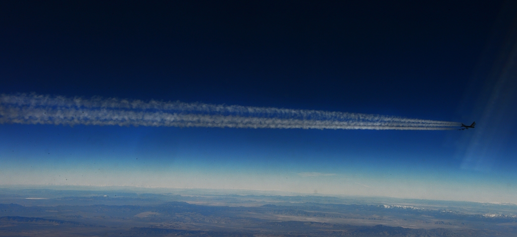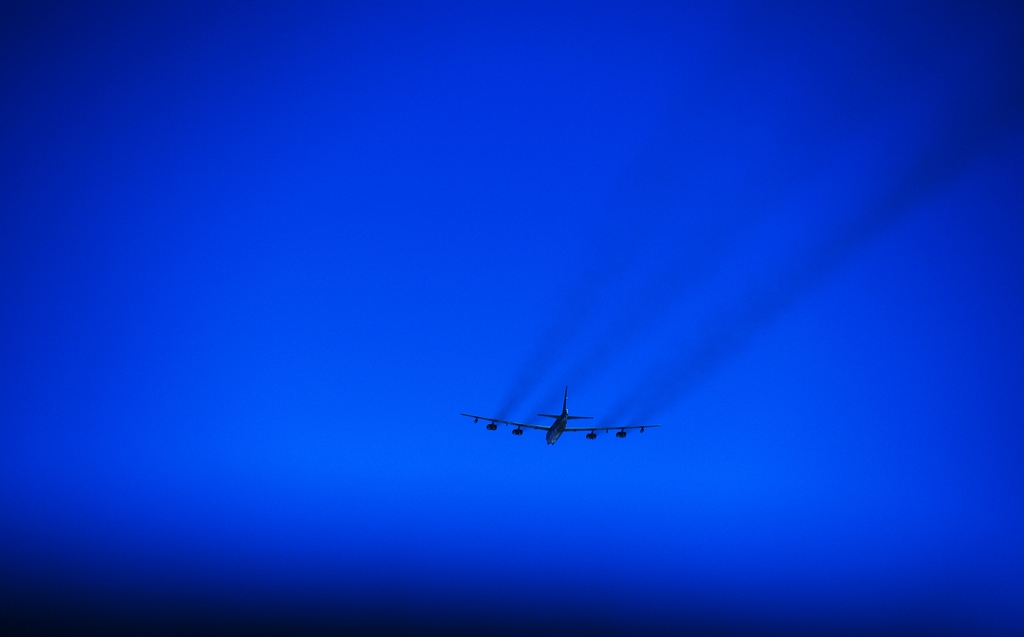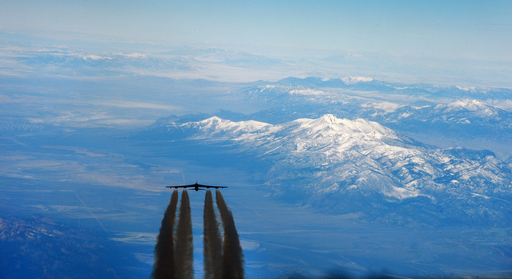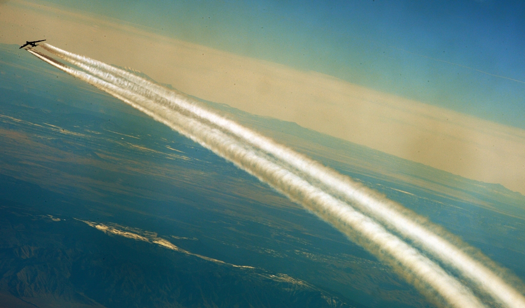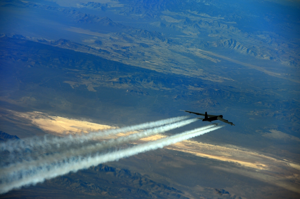 The B-52 has eight turbojet engines, each capable of producing 17,000 pounds of thrust, with a top speed of 650 miles per hour. They leave long white contrails over Nevada during the training mission.