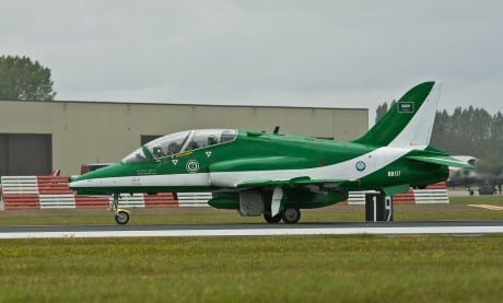 The Team,ย based at theย King Faisal Air Base (Tabuk) in northwestern Saudi Arabia, fly the BAE Hawk Mk65 & 65A that have been specially modified with smoke generators by BAE and are painted in a very pretty green and white scheme.