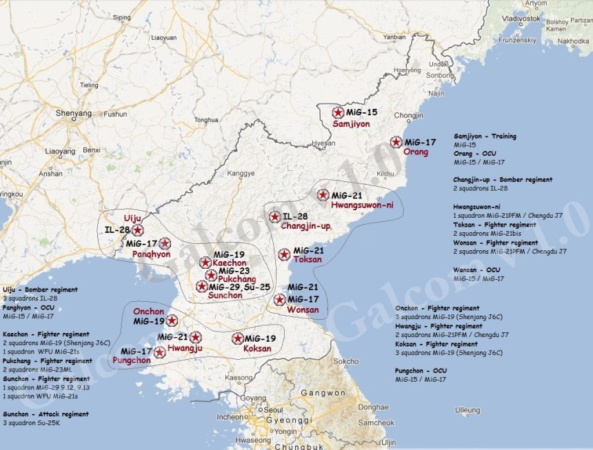The following interesting map shows all the airbases in North Korea with a quite detailed list of the Regiments and Squadrons of the Korean People’s Army Air Force (North Korean Air Force).