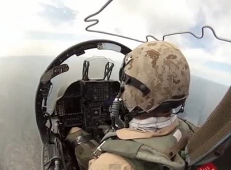It shows Capt. David Neely, an AV-8B Harrier Pilot assigned to Marine Medium Tiltrotor Squadron (VMM) 266 (Reinforced), 26th Marine Expeditionary Unit (MEU), during a mission off the USS Kearsarge (LHD3), Mediterranean Sea, Mar. 28, 2013.