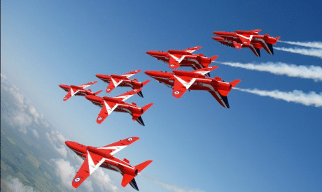“The Royal Air Force Aerobatic Team, the Red Arrows, have designed a display of precision formation flying that encapsulates the agility and demonstrates the pure flying qualities required in the Royal Air Force. The Reds are an iconic symbol of the United Kingdom and their displays are vividly demonstrating excellence in precision, teamwork and dynamic flying.