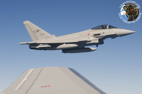 The pictures, taken by The Aviationist’s contributor Alessandro Fucito, not only show the F-2000s plugging into the refueling basket of the Boeing tanker, but also the refueler’s remote vision system and the Typhoon pilots adveniristic helmet.