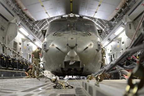 The following images where released by the UK MoD, and show one of the large, partly disassembled choppers (the same used for the 2012 Olympic opener and latest 007 movie) inside a RAF C-17 Globemaster transport aircraft used to bring the Merlins back home.