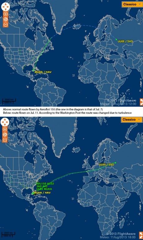 However, on Jul. 11 it flew a different route, a southern route that completely avoids the U.S. airspace (for the history of such flight in the last weeks take a look here). Furthermore, AFL150 is the same flight believed to be carrying the NSA leaker Edward Snowden a couple of weeks ago, when some journalist boarded the plane to find the accused spy’s seat empty.