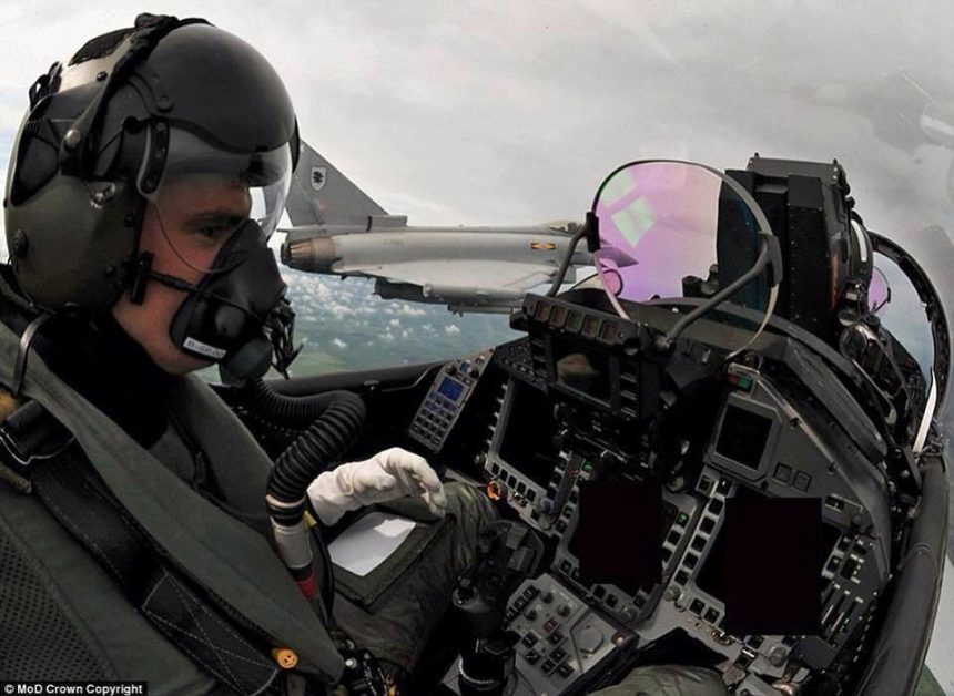 This is one of those photographs that don’t need much comments. Taken from the backseat of a RAF Eurofighter Typhoon the fish-eye image literally brings you aboard the multi-role fighter jet flying in formation with an another aircraft of the same type.