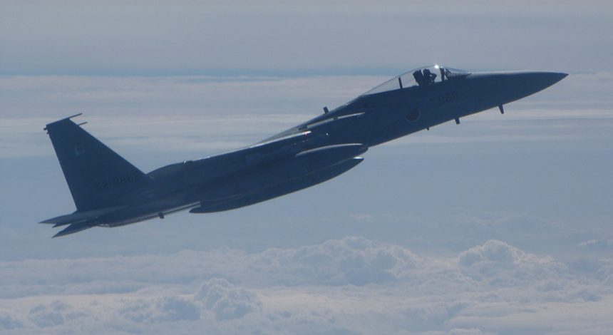 A JASDF F-15J on the right hand wing of the intercepted plane near Japan.