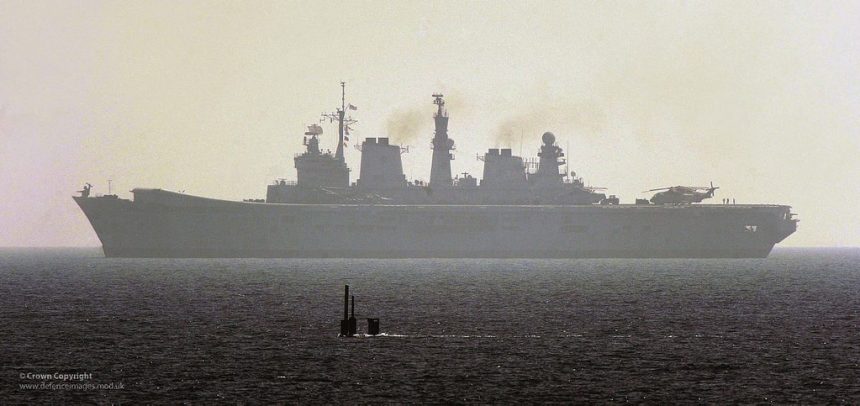 Released by the UK Ministry of Defense, this image shows the periscope of the American submarine USS Dallas cutting through the surface as UK aircraft carrier HMS Illustrious sails past.