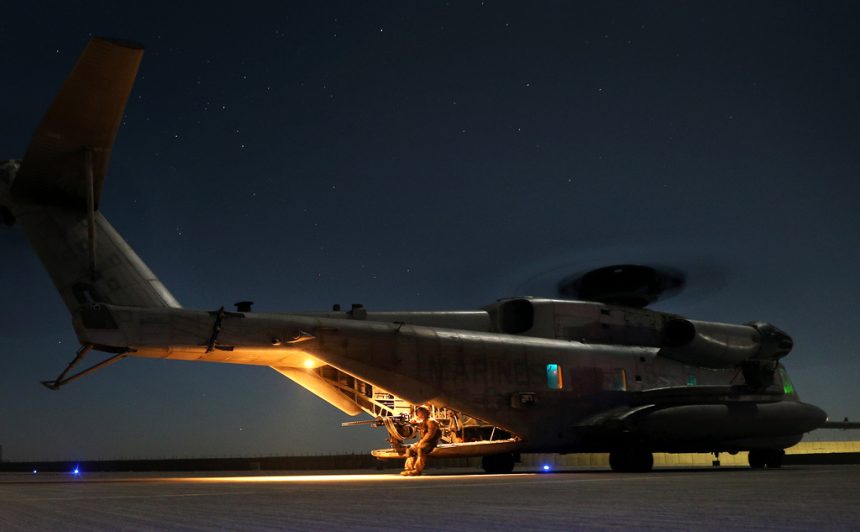 The following image shows a lonely CH-53E Super Stallion assigned to Marine Heavy Helicopter Squadron 462 (HMH-462) on the ground, during an operation at Forward Operating Base Price, Helmand province, Afghanistan, on Dec. 17, 2013.