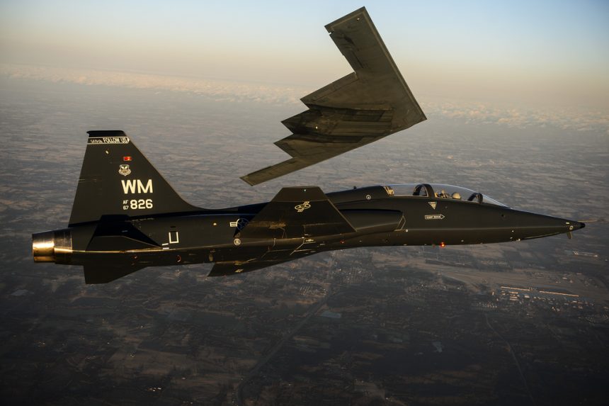 The image above shows something you donโt see every day: a T-38 Talon and a B-2 Spirit , both flying with the 509th Bomb Wing, during a training mission over their homebase at Whiteman Air Force Base, Missouri, on Feb. 20, 2014.