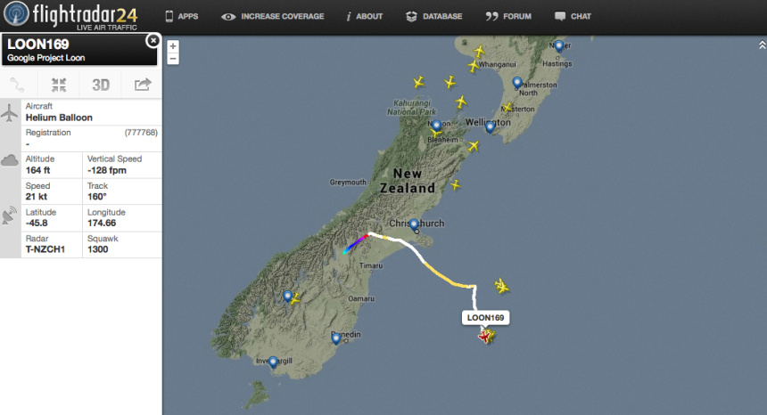 If you point your browser to Flightradar24.com and zoom off the coast of New Zealand, youโll see 7 slow moving aircraft: these are actually helium balloons, part of Googleโs Project Loon, broadcasting their position, speed, altitude etc. via Mode-S ADS-B.