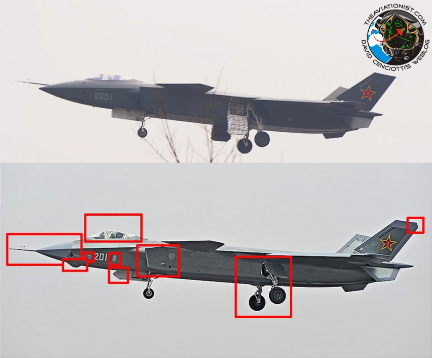 Use the top image to check on the one below (click for a higher resolution image) some of the differences between J-20 “2001” (first prototype) and J-20 “2011”.