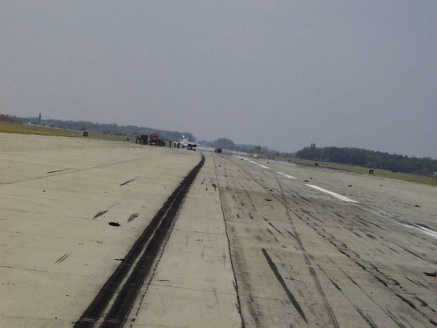 As you can see, in spite of yawing to the left, the aircraft finished its landing run within the runway. As a consequence of the antiskid failure, there were burst/exploded tyres with subsequent damage to the wheel-rims.