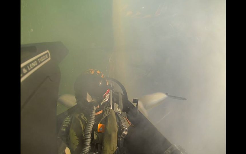Fog in the cockpit of Royal Netherlands Air Force F-16 demo team during Roma International Air Show.