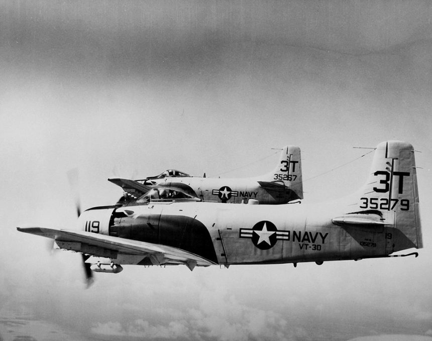The U.S. Navy Skyraiders last combat tour took place from July 1967 to 1968 onboard USS Coral Sea (CV-43), but this versatile propeller aircraft continued to fly with the U.S. Air Force and with the Vietnamese Air Force until the end of the conflict thanks to its unparalleled capabilities in close air support.