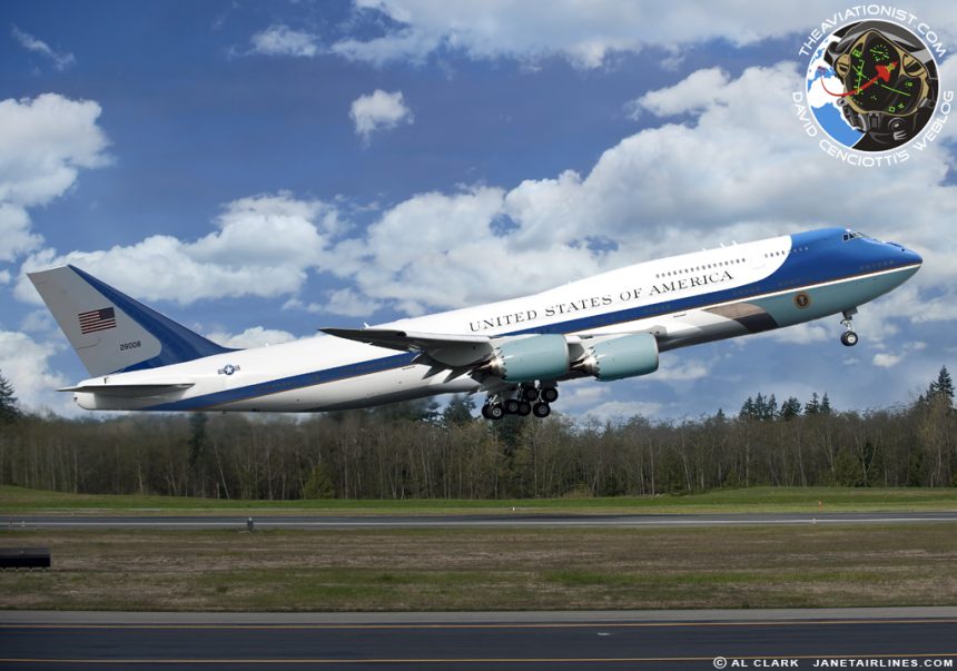 When, about three years ago, the selection of the Boeing 747-8 became obvious, we asked our contributor Al Clark to prepare a digital mock-up of the new plane sporting the Air Force Oneโs traditional light-blue and sky-blue color scheme that you can find on top of this article.