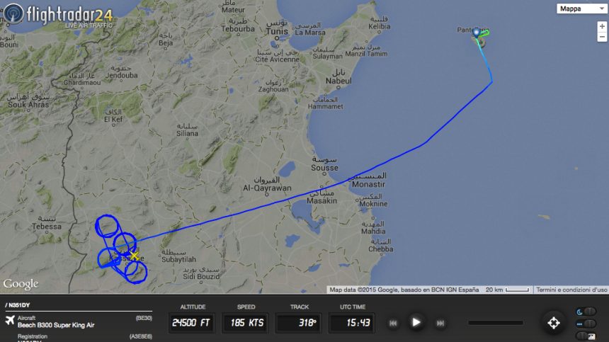 The news, exposed by the Corriere della Sera newspaper, was unveiled by Tunisian bloggers who noticed the civil-registered plane on Flightradar24.com: in fact, although it was probably involved in an intelligence gathering mission, the King Air โN351DYโ did not turn off its ADS-B transponder and could be clearly tracked on the popular website (as already happened to other U.S. spyplanes over Afghanistanโฆ) as it circled over the Jebel Chambi mountain between 22,500 and 24,500 feet.