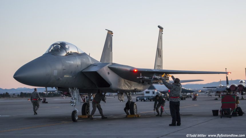 As regular observers know, there is always plenty of non-flag activity on the Nevada Test and Training Range (NTTR) and at Nellis AFB. A couple of F-15s return from a non-flag sortie, and taxi to their parking spot mere feet away. No waiting for a gate agent here, they are greeted by crew already in place, jumping into action to assist in the aircrafts shutdown and post flight inspection.