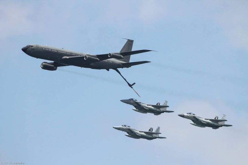 Formations of F-16s, A-4s along with F-15s trailing a B-707 tanker, C-130s, CH-53s and several other Israeli Air Force aircraft took part in the aerial display.