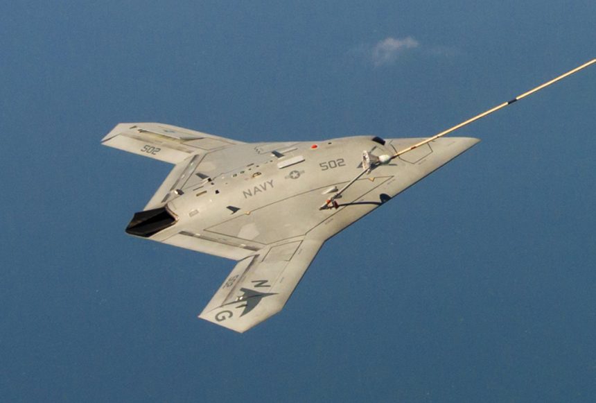 On Apr. 16, one of the two Unmanned Carrier Air Vehicle demonstrator (UCAS-D) aircraft of the X-47B program performed the first autonomous drone air-to-air refueling (AAR) test taking fuel from an Omega Air KC-707 tanker.