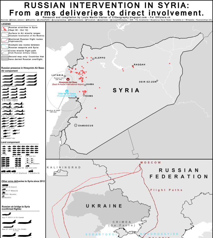 Prepared by CIGeographyโs Louis Martin-Vรฉzian for the Offiziere.ch, the infographic in this post shows the evolution of Russiaโs intervention in Syria: from the military build-up, to the deployment of the Russian Air Force attack planes to Latakia, to the air strikes conducted against terrorist targets across the country.