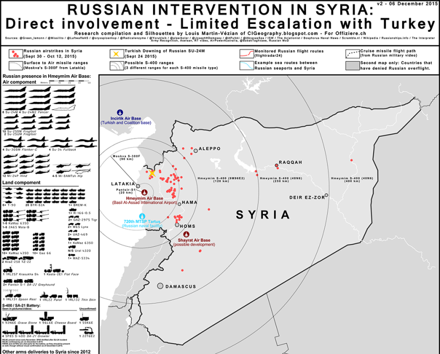 At the end of October we posted the first version of this infographic about the Russian Intervention in Syria, prepared by Louis Martin-Vรฉzian of CIGeography. Many things have happened since then: the Russian Air Force has carried out raids using its Strike Bomber Force directly from mainland Russia; a Su-24M Fencer was shot down by a Turkish Air Force F-16 after an alleged violation of the Turkish airspace; the Moskva missile cruiser has started operating off Syria, and an S-400 battery has been installed at Latakia.