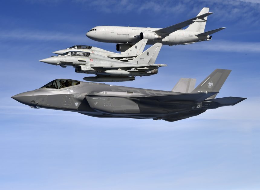 It was pretty much an Aeronautica Militare (Italian Air Force) achievement: the aircraft was the ItAFโs first F-35, the first JSF built outside the U.S., piloted by one of the two ItAF test pilots, belonging to the Reparto Sperimentale Volo (Test Wing) from Pratica di Mare, who successfully completed the training at Luke AFB in November last year, and supported by a formation made by 2x KC-767s, 2x C-130Js and 2x Typhoons, all belonging to the Italian Air Force.