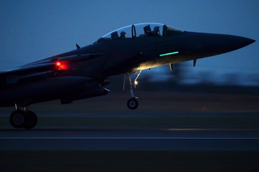 A spokesman for RAF Lakenheath explained that, even though the F-15Eย aircrew has beenย momentarily disoriented, the fighter jetย was able to land safely.