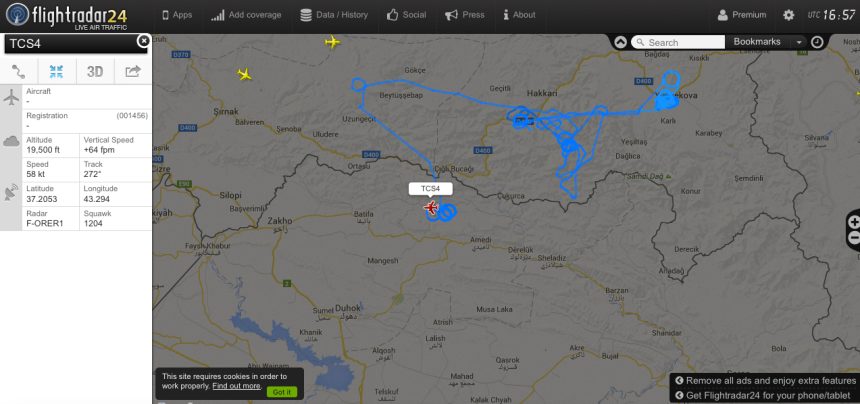 A small aircraft or most probably a UAV, whose track appear to have originated from Turkey, is circling over northern Iraq, north of Mosul, being tracked by a feeder (a user with commercial off-the-shelf receiver available on the market) located in Erbil.