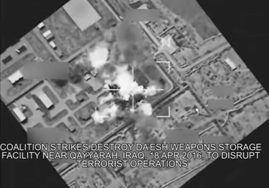 Editor’s note: the video that showed the air strike on the target in Iraq through the B-52’s targeting pod has since been removed. The top screenshot is all what has remained available of that first weapons drop in Iraq. Interestingly, the same video was also included in a tweet by the OIR Spokesperson, that has been deleted as well.