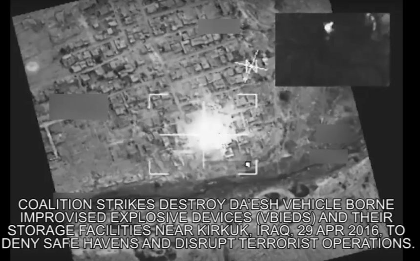 The following video was filmed on April 29 where the B-52s attacked multiple vehicle borne improvised explosive devices (VBIEDs) and their storage facilities near Kirkuk, Iraq, to deny safe havens and disrupt terrorist operations.