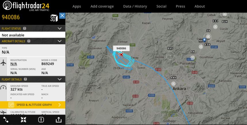 Quite surprisingly a Turkish Air Force F-16C Block 50 could be tracked on Flightradar24.