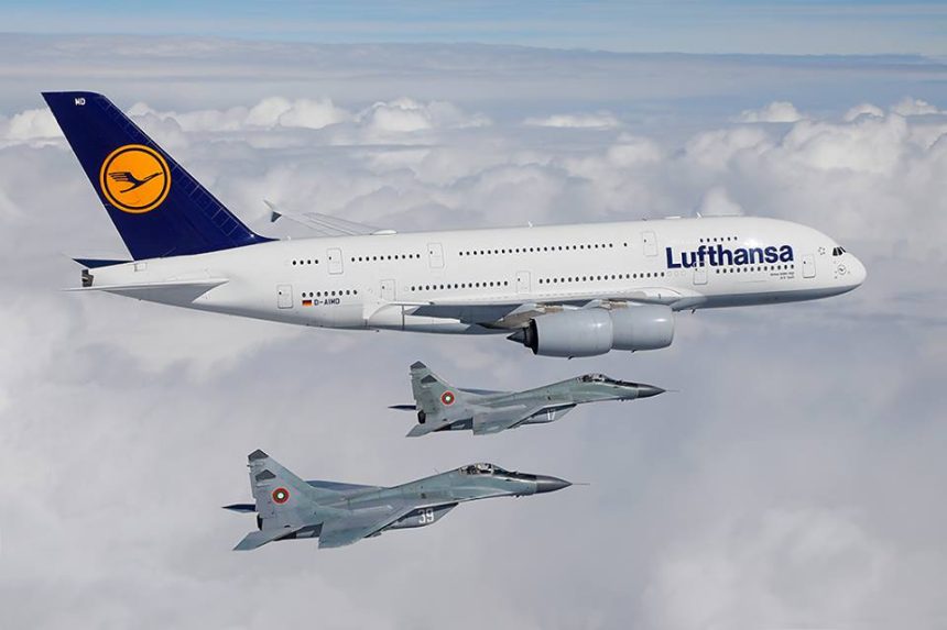 Bulgarian Air Force Fulcrums greeted the very first visit of an Airbus A380 to Sofia.