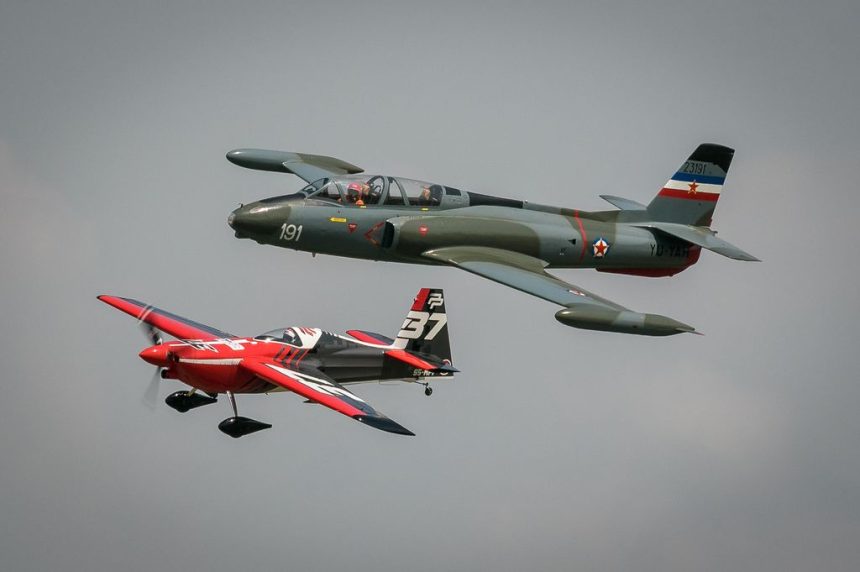 A pretty unusual formation featuring the Peter Podlunsek Racing Team / PP37โs Zivko Edge 540 V2 raceplane and a Soko G-2 Galeb trainer.